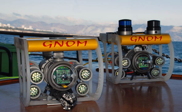 GNOM PRO 2 — ist ein vollausgerüsteten und mächtigen Roboter aus der Reihe GNOM. Erweitert Dieses Gerät Ihre Möglichkeiten: gilt für die Arbeit mit der Option des Manipulators, hochauflösendes Sonar mit großer Reichweite, hydroakustisches Navigationssystem. Komplett mit mächtigen Antrieben und verstärkter Beleuchtung erweitert GNOMs Anwendungsbereich, verwandelt ihn in Such- und Rettungsgerät. Es gibt Möglichkeit für Modernisierung dieses Geräts für die Arbeit in der Tiefe bis zu 250m und Vergrößerung des Kabels bis zu 300m.